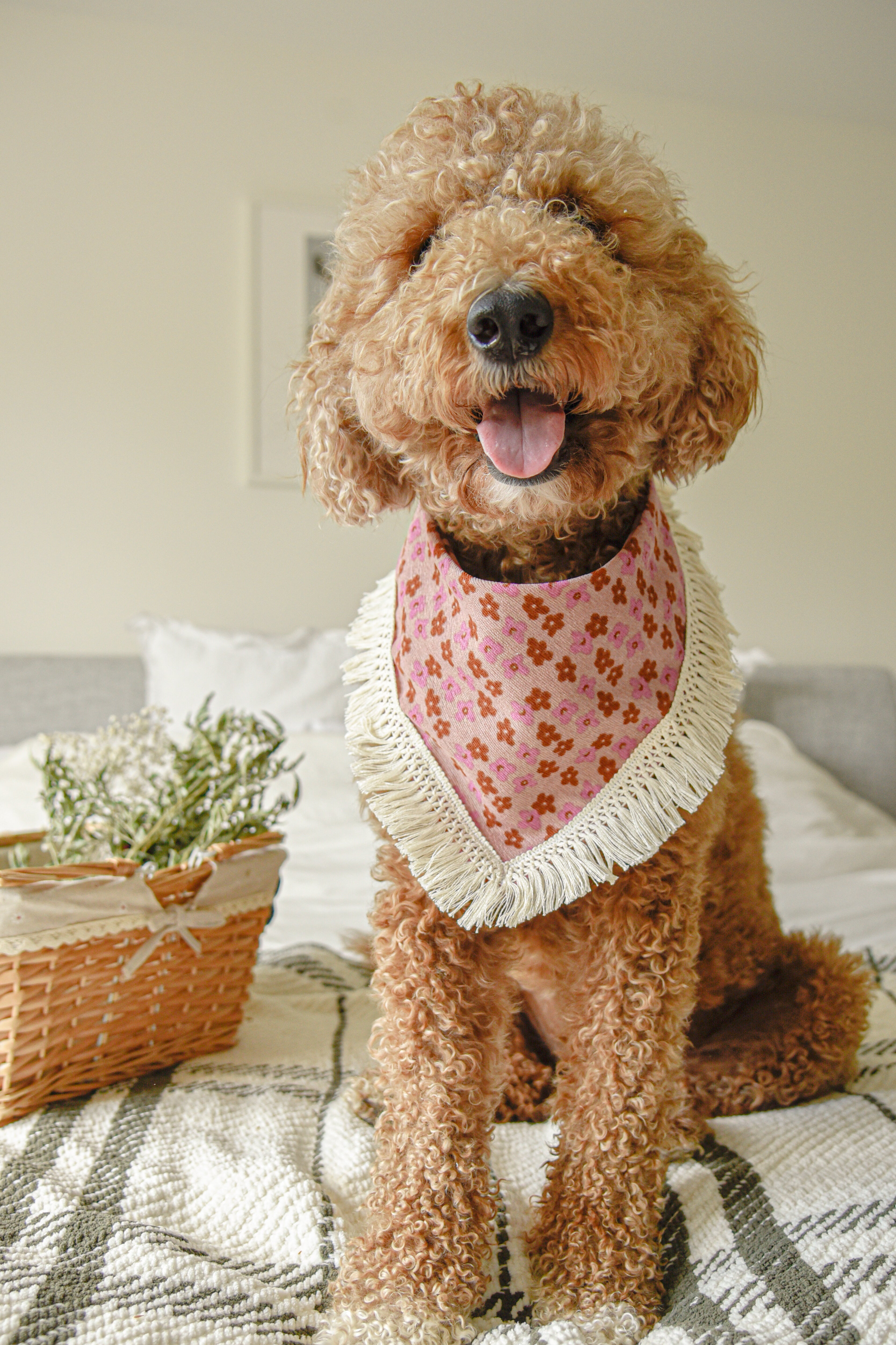 Floral Corduroy Pet Bandana with Tassel: Snap-On Dog Cat Bandana